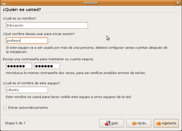 ¿Cuál es su nombre?: Aquí puede introducir su nombre y sus apellidos. En nuestro caso hemos introducido ‘Educacion’.