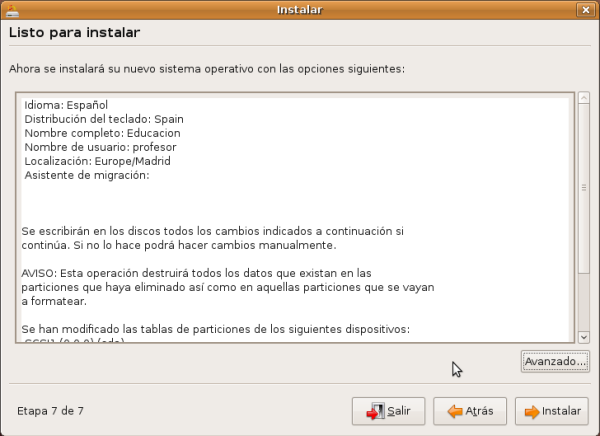 En la siguiente etapa, se mostrará un resumen de las opciones de instalación elegidas, por si decide volver atrás para modificarlas. Si no decide modificar ninguna de las opciones de instalación elegidas pulse el botón Instalar que se puede ver en la siguiente figura.