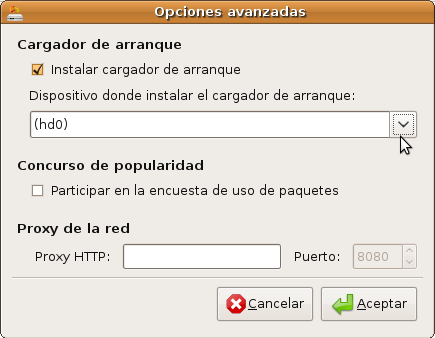 A continuación, es posible que se nos presente la siguiente pantalla, en cuyo caso deberemos indicar el lugar donde será instalado el cargador de arranque, dejando seleccionadas las opciones que por defecto nos ofrecerá el asistente, y pulsando en la pantalla correspondiente directamente sobre el botón "Aceptar".