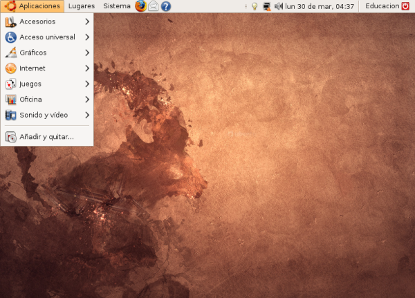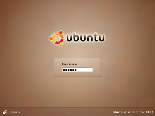 Una vez introducida la contraseña, si ésta es correcta, iniciaremos la sesión ante el sistema. Se nos mostrará el escritorio de Ubuntu. En él podemos observar la barra de menús, en la cual encontraremos también los iconos de lanzamiento rápido (ej.: Firefox, correo, ayuda de Ubuntu) y los iconos de las aplicaciones lanzadas (ej.: Gestor de Red), la fecha y la hora del sistema, el nombre real del usuario que inició sesión, y un icono con forma de interruptor de apagado desde el cual podremos realizar tareas tales como salir de sesión, cambiar de usuario o reiniciar el sistema. En el final de la pantalla nos encontramos con el icono del escritorio virtual y el icono que representa la papelera de reciclaje.