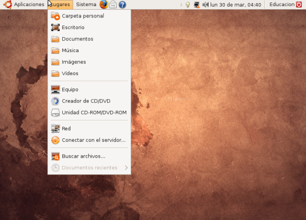Desde la siguiente opción del menú (Lugares) podremos acceder a nuestra carpeta personal, a las carpetas de Música, Imágenes, Vídeos, a la unidad de CD/DVD, a los recursos de la red o a la búsqueda de archivos, entre otras opciones, tal como podemos ver en la siguiente figura.