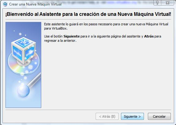 Para crear la máquina virtual utilizaremos el asistente de VirtualBox. Iniciamos VirtualBox y en su pantalla principal pulsamos sobre el icono subtitulado "Nueva" o bien desde el menú "Máquina -> Nueva". Aparecerá el asistente de creación de máquinas virtuales que mostramos en la siguiente figura: