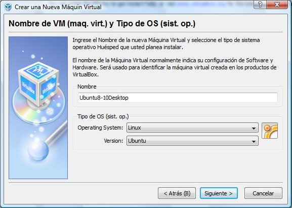 Pulsaremos sobre el botón Siguiente y aparecerá la figura que mostramos a continuación. En ella introduciremos el nombre que le queramos dar a la máquina virtual. Este nombre identifica una cierta configuración Hardware-Software y nos permite diferenciar entre distintas máquinas virtuales que hayamos creado con VirtualBox. En nuestro caso le hemos dado como nombre ‘Ubuntu8-10Desktop’. También desde aquí podemos indicar el tipo de sistema operativo (Linux en nuestro caso) y la versión del mismo (Ubuntu).