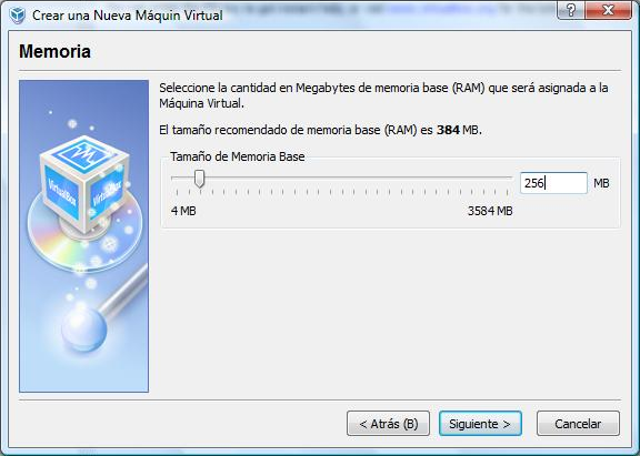 A continuación seleccionaremos la cantidad de memoria en MB que asignaremos a la máquina virtual, dejando en nuestro caso 256 MB.