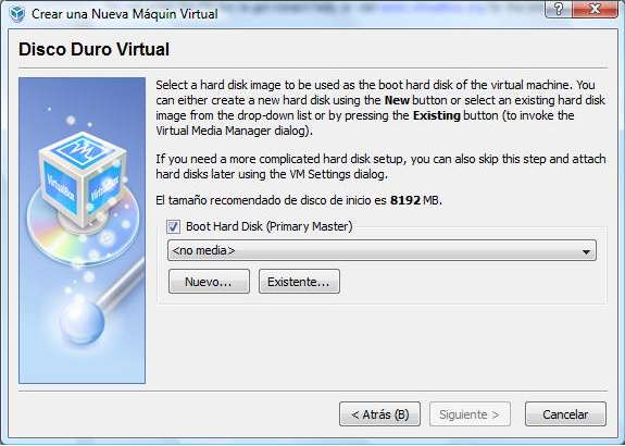 A continuación crearemos un disco duro virtual que será utilizado como disco duro de arranque de la máquina virtual. Desde el asistente podemos seleccionar una imagen de disco duro virtual existente o bien crear uno nuevo. En nuestro caso optaremos por crear uno nuevo.