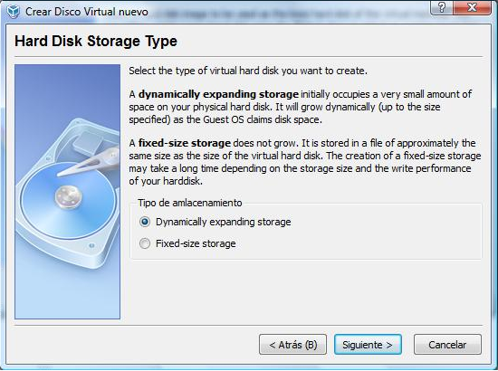 El disco duro virtual es en realidad un fichero almacenado en una carpeta del disco duro del sistema operativo anfitrión. El espacio que ocupa este fichero, el cual simulará el disco duro virtual, puede asignarse en su totalidad en este mismo momento (se creará inicialmente vacío con el tamaño en GB indicado) o bien se puede indicar que vaya creciendo dinámicamente (hasta un máximo prefijado) a medida que las necesidades de disco del sistema operativo invitado (Ubuntu en nuestro caso) se van haciendo mayores. En nuestro caso seleccionaremos como tipo de almacenamiento el de crecimiento dinámico (primera opción) tal y como podemos ver en la siguiente figura: