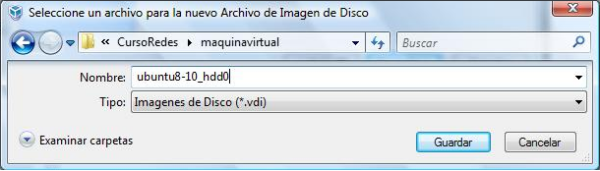 A continuación si pulsamos sobre el icono situado a la derecha de la caja de texto Location, podremos especificar la ruta donde será creado el nuevo disco duro virtual, en nuestro caso, el archivo está ubicado en ‘F:\CursoRedes\maquinavirtual’ pero se puede seleccionar para el mismo la ubicación que se desee dentro del sistema de archivos de su máquina, o dar por válidos los valores ofertados por defecto. Tras ello pulsaremos sobre el botón Guardar en la siguiente figura.