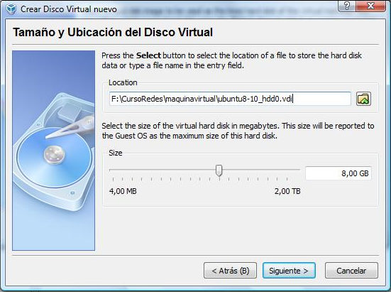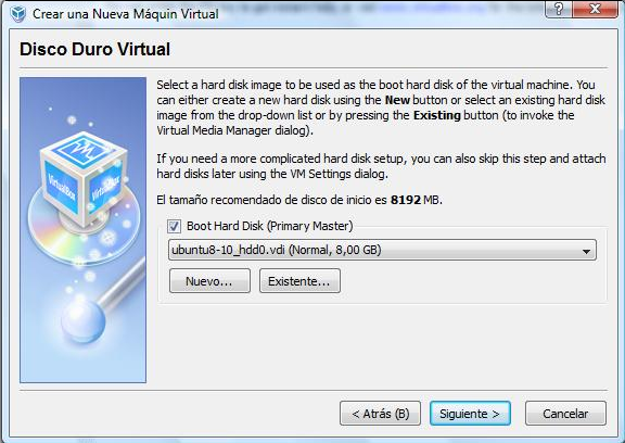 A continuación indicaremos el nombre y ubicación del archivo que simulará nuestro disco duro virtual, así como el tamaño máximo que tendrá. En nuestro caso el archivo se llama ‘ubuntu8-10_hdd0.vdi’ y hemos indicado para él un tamaño máximo de 8 GB, tal y como se muestra en la siguiente figura, tras lo cual pulsaremos sobre el botón Siguiente.