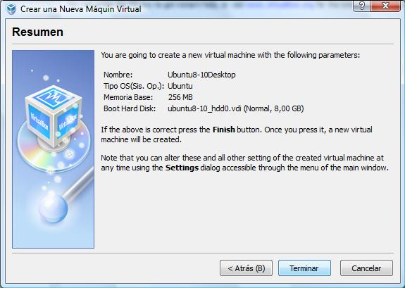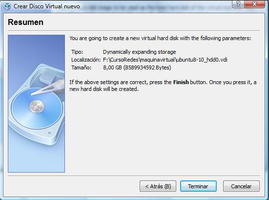 Pasaremos, a continuación, a la pantalla Resumen, donde podremos ver un resumen de las elecciones realizadas para el disco duro virtual. Si estamos de acuerdo, pulsaremos sobre el botón Terminar. En caso contrario, podremos cambiar cualquier configuración establecida para el disco duro virtual pulsando el botón Atrás.