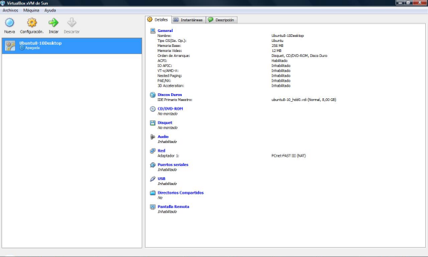 A continuación veremos la pantalla principal de VirtualBox, donde se nos muestra en la pestaña Detalles, las elecciones de configuración principales realizadas en la configuración de la nueva máquina virtual, tal y como se muestra en la siguiente figura.