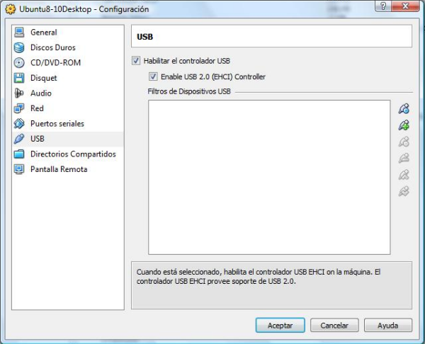Aún así, no hemos todavía terminado de configurar la máquina virtual en la que instalaremos Ubuntu. Pulsaremos sobre el icono de rueda dentada naranja de la barra de herramientas de VirtualBox para añadir nuevos elementos a la configuración de la máquina. Comenzaremos añadiendo un controlador USB tal y como podemos observar en la siguiente figura.