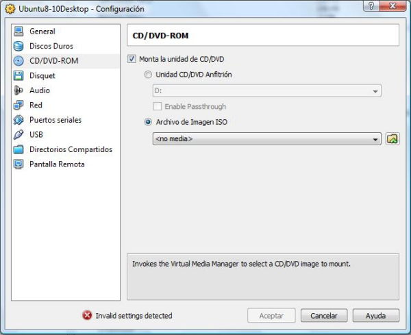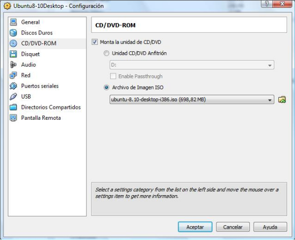 A continuación procederemos a insertar una unidad de CD/DVD. Estas unidades las podemos mapear a las unidades físicas del equipo anfitrión, o bien mapearlas a ficheros ISO que contengan imágenes de CDs/DVDs. Estos ficheros podemos crearlos con programas de libre distribución como AcetoneISO. En la siguiente figura vemos como vamos a vincular la unidad de CD/DVD de la máquina virtual a una imagen ISO.