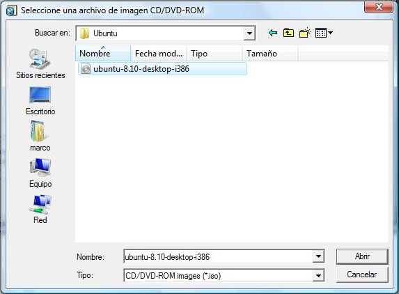 A continuación seleccionamos la ubicación y el nombre del fichero de imagen ISO. En nuestro caso este fichero es ubuntu-8.10-desktop-i386.iso, la imagen ISO del DVD de instalación de Ubuntu 8.10 Desktop . Pulsamos a continuación el botón Abrir.