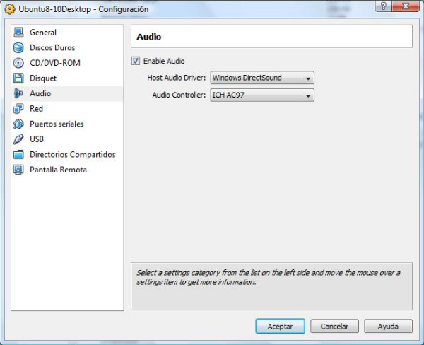 Volveremos a la pantalla principal del asistente de configuración y seleccionaremos a continuación la categoría Audio. Marcaremos la casilla Enable Audio y seleccionamos el driver y el dispositivo de audio que mapearemos a la máquina virtual, tal y como vemos en la siguiente figura.