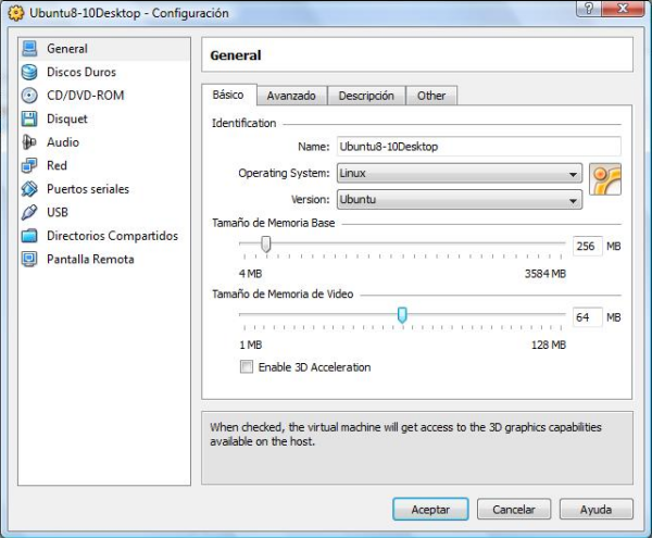Comenzaremos pues dimensionando la máquina virtual necesaria para instalar Ubuntu 8.10. Para ello nos fijaremos en los requisitos mínimos de instalación de este Sistema Operativo, realizando en nuestro caso una instalación con una configuración por encima de dichos requisitos mínimos para que la máquina virtual pueda ser ejecutada eficientemente.