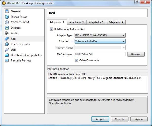 En la categoría Red seleccionaremos Interface Anfitrión en el apartado "Attached to", tal y como mostramos en la siguiente figura.