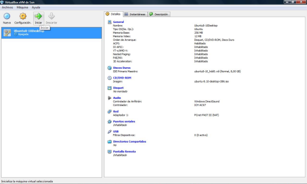 Hemos acabado finalmente de configurar nuestra máquina virtual con este último paso. Pulsaremos sobre el botón Aceptar y volveremos a la pantalla principal de VirtualBox. En la pestaña Detalles, podremos observar la configuración final de la máquina virtual. Pulsaremos el botón Iniciar de la barra de herramientas de VirtualBox como se muestra en la siguiente figura.
