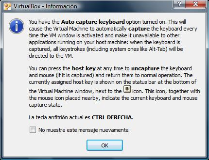 Comenzará a arrancar la máquina virtual recién creada. Aparecerá una ventana con información que nos indicará que tenemos la opción de Auto captura activada. Esto ocasionará que la máquina virtual capture las pulsaciones de teclado y ratón cada vez que la ventana de la máquina virtual tiene el foco. Para hacer que el teclado y el ratón vuelvan a estar disponibles para otras aplicaciones en el anfitrión deberá pulsar la tecla CTRL que se encuentra a la derecha del teclado. Para hacer que la máquina virtual vuelva a tener el foco de entrada de datos simplemente deberá hacer clic sobre cualquier parte de la ventana donde se ejecuta la máquina virtual.