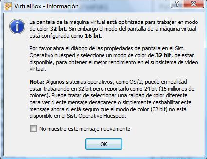 Nos muestra a continuación una pantalla donde nos indica la profundidad de color que tiene actualmente la pantalla de la máquina virtual. Pulsaremos Aceptar.