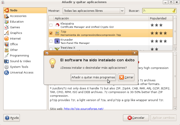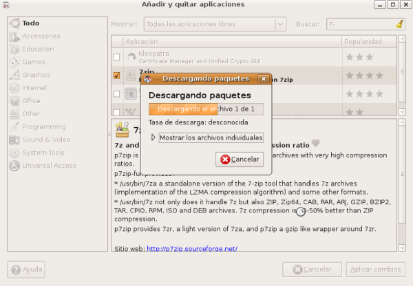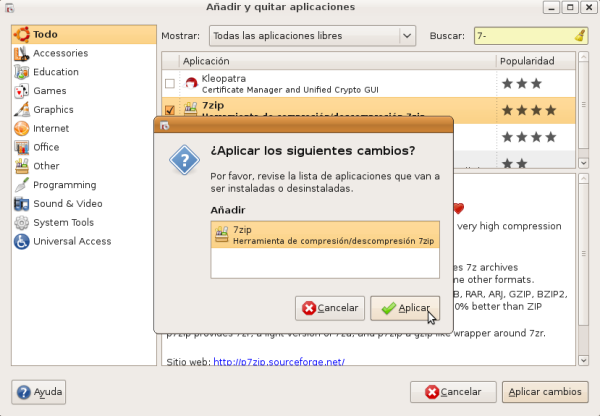 En el desplegable "Mostrar" seleccionamos "Todas las aplicaciones disponibles", y en el cuadro de diálogo Buscar del instalador de aplicaciones escribimos 7- y rápidamente veremos que aparece la aplicación buscada. Marcamos la casilla de verificación y pulsamos el botón de Aplicar cambios.