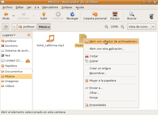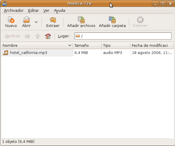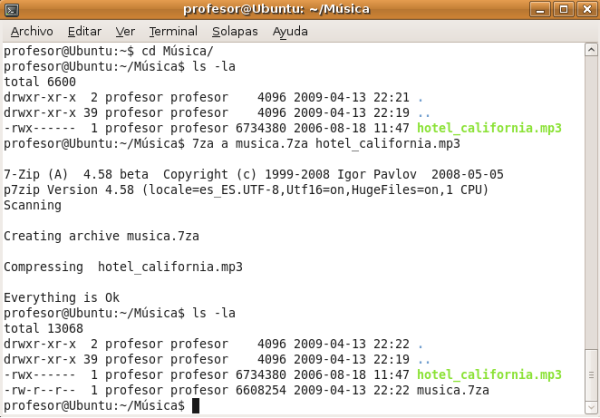 Lance una terminal y pruebe a comprimir un archivo desde la línea de comandos. En nuestro caso hemos comprimido un archivos mp3 (hotel_california.mp3) que hemos ubicado en la carpeta Música del usuario profesor, en un archivo denominado musica.7za utilizando la siguiente orden: