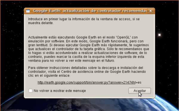 Una vez hecho esto lance de nuevo Google Earth desde Aplicaciones->Internet->Google Earth.