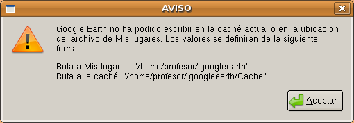 A continuación se nos presentará la siguiente pantalla, que nos informará de que no se puede crear la caché de GoogleEarth en el perfil del usuario "root"; pulsaremos en dicha ventana sobre el botón "Aceptar".