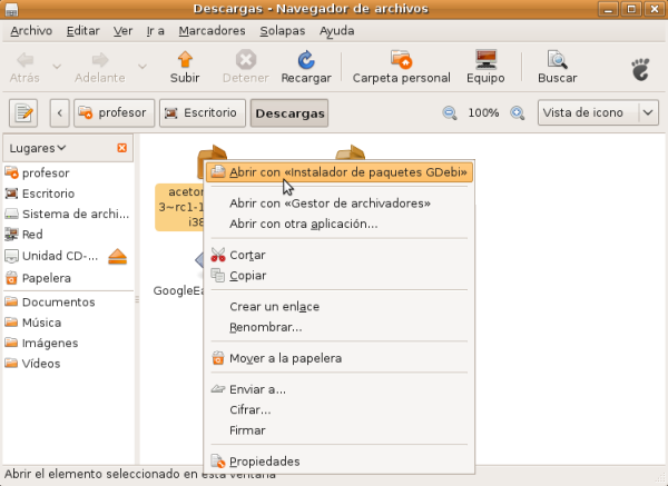 De igual manera, también es capaz de crear imágenes a partir de un CD o un DVD y convertir imágenes entre diferentes formatos. Además, AcetoneISO contiene otras funcionalidades adicionales como la extracción automática de un archivo AVI desde un DVD, conversión de un archivo en formato FLV a formato AVI o incluso la descarga de vídeos de Youtube. Para instalarlo abrimos la carpeta Descargas (dónde lo habíamos guardado anteriormente después de descargarlo) y sobre el fichero pulsamos el botón derecho del ratón. Aparecerá el menú contextual y en él seleccionaremos Abrir con el <<instalador de paquetes GDebi>>.