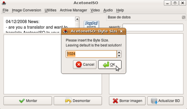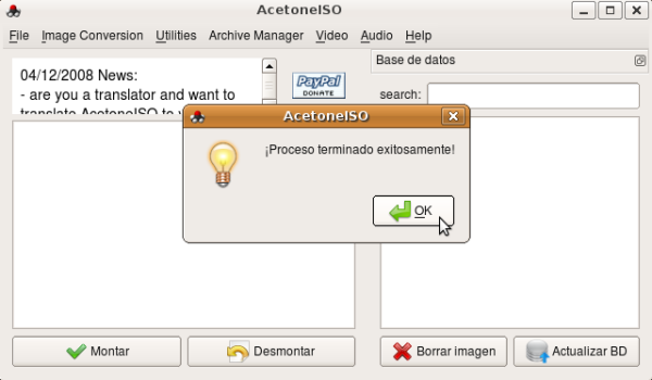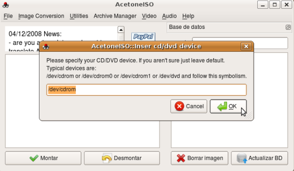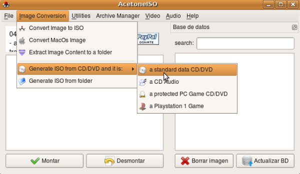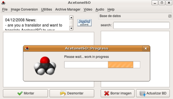 AcetoneISO es una aplicación gratuita y de código abierto para GNU/Linux que te permitirá manipular imágenes de CDs y DVDs con total facilidad. AcetoneISO es capaz de manejar imágenes ISO, BIN, NRG, MDF o IMG, y de realizar operaciones de montaje, creación y verificación de archivos MD5, encriptado y desencriptado de imágenes o compresión y descompresión de las mismas.