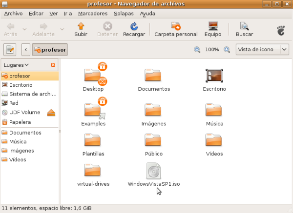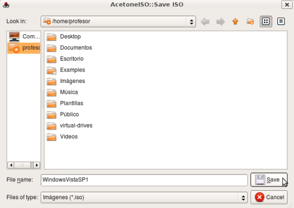 Seleccionaremos la carpeta, el nombre que le vamos a dar al fichero de imagen y su tipo. En nuestro caso el fichero se llamará WindowsVistaSP1.iso y se almacenará en la carpeta particular del usuario profesor. Pulsaremos el botón Save.