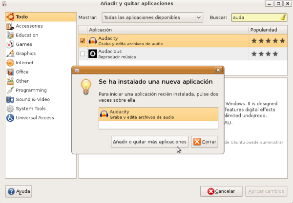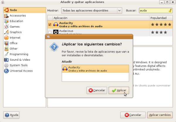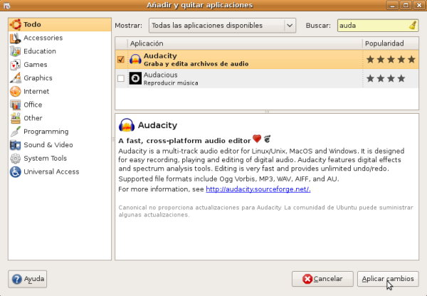 Audacity es un programa libre y de código abierto para grabar y editar sonidos. Está disponible para Mac OS X, Microsoft Windows, GNU/Linux y otros sistemas operativos. Para instalarlo abrimos el instalador de aplicaciones. En el cuadro de diálogo Buscar del instalador de aplicaciones escribimos auda y rápidamente veremos que aparece la aplicación buscada. Marcamos la casilla de verificación y pulsamos el botón de Aplicar cambios.