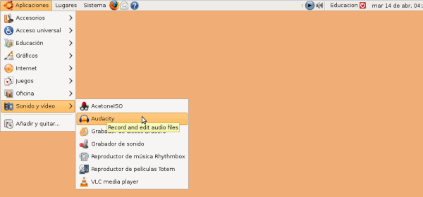 Para probar la aplicación recién instalada la lanzaremos desde Aplicaciones->Sonido y vídeo->Audacity.