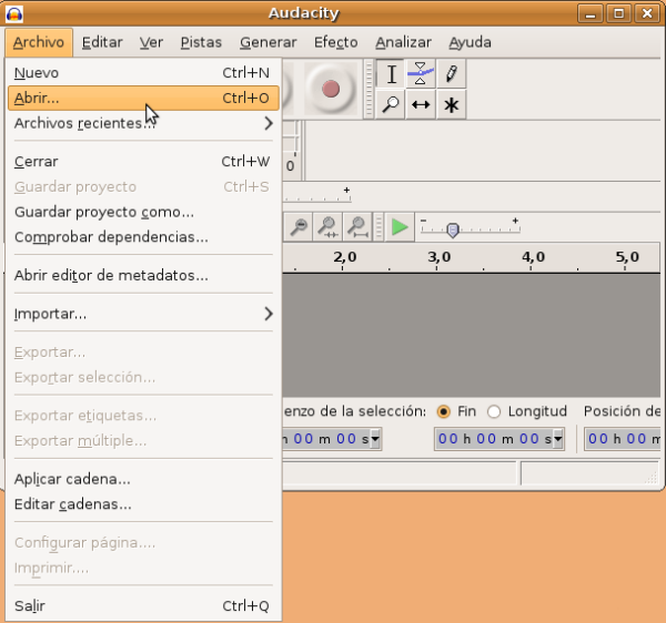 Abriremos un archivo de audio para probar el funcionamiento del programa recién instalado. Para ello seleccionamos Archivo->Abrir en el menú principal.