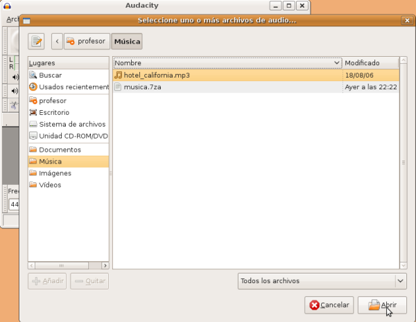 Navegamos hasta la carpeta donde tenemos el archivo (en nuestro caso la carpeta Música del directorio personal del profesor), lo seleccionamos y pulsamos el botón Abrir.