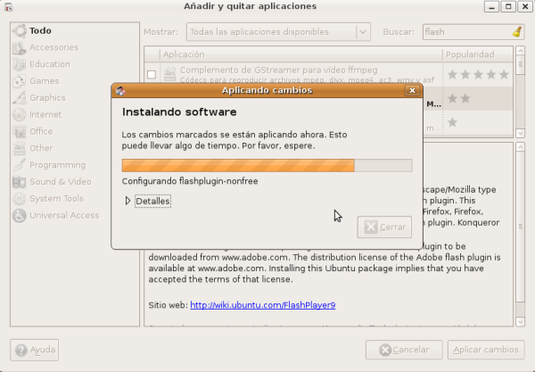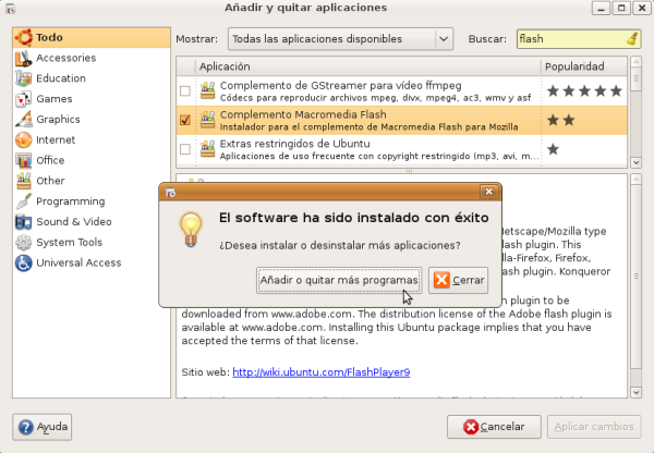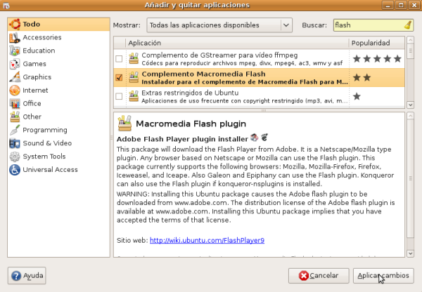 Adobe Flash es una aplicación en forma de estudio de animación que trabaja sobre "Fotogramas" destinado a la producción y entrega de contenido interactivo para diferentes audiencias alrededor del mundo sin importar la plataforma. Actualmente está desarrollado y distribuido por Adobe Systems, y utiliza gráficos vectoriales e imágenes ráster, sonido, código de programa, flujo de vídeo y audio bidireccional. En sentido estricto, Flash es el entorno y Flash Player es el programa de máquina virtual utilizado para ejecutar los archivos generados con Flash. Los archivos de Flash, que tienen generalmente la extensión de archivo SWF, pueden aparecer en una página web para ser vista en un navegador, o pueden ser reproducidos independientemente por un reproductor Flash. En este caso instalaremos el plugin para Mozilla Firefox. Para instalarlo abriremos el instalador de aplicaciones. En el desplegable "Mostrar" seleccionamos "Todas las aplicaciones disponibles", y en el cuadro de diálogo Buscar del instalador de aplicaciones escribimos flash y rápidamente veremos que aparece la aplicación buscada. Marcamos la casilla de verificación y pulsamos el botón de Aplicar cambios.