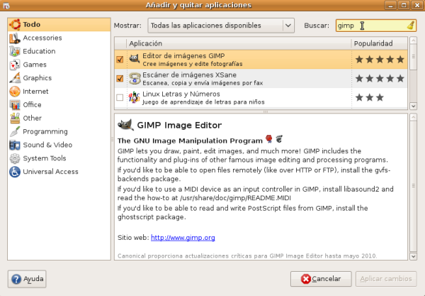 GIMP (GNU Image Manipulation Program) es un programa de edición de imágenes digitales en forma de mapa de bits, tanto dibujos como fotografías. Es un programa libre y gratuito. Está englobado en el proyecto GNU y disponible bajo la Licencia pública general de GNU. Se le puede considerar como una alternativa firme, potente y rápida a Photoshop para muchos usos, aunque no se ha desarrollado como un clon de él y posee una interfaz bastante diferente. Para instalarlo abrimos el instalador de aplicaciones. En el cuadro de diálogo Buscar del instalador de aplicaciones escribimos gimp y rápidamente veremos que aparece la aplicación buscada. En este caso veremos que la aplicación ya se encuentra instalada, ya que es una de las aplicaciones que se instala por defecto durante el proceso de instalación de Ubuntu.