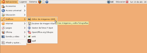 Lanzaremos la aplicación desde Aplicaciones->Gráficos->Editor de imágenes GIMP, tal como se puede ver en la siguiente figura.