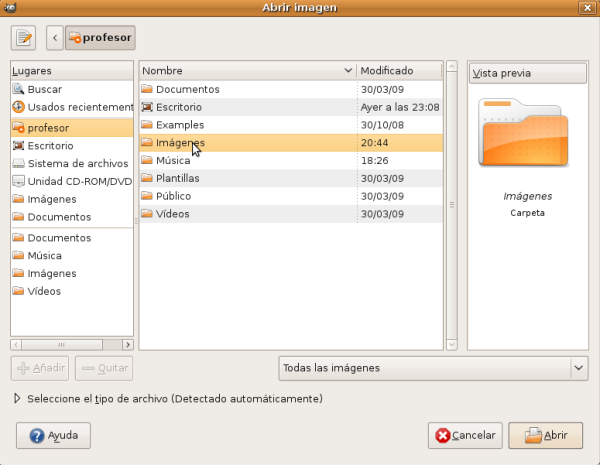 Navegaremos hasta una carpeta (en este caso la carpeta Imágenes) donde podamos encontrar archivos de imágenes y pulsaremos Abrir, para observar el contenido de la carpeta.