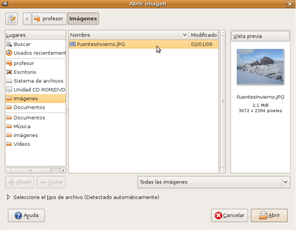 Dentro de la carpeta Imágenes incluimos un archivo de imagen, en nuestro caso un archivo denominado FuentesInvierno.jpg. Seleccionaremos la imagen y pulsaremos el botón Abrir. GIMP lee y escribe la mayoría de los formatos de ficheros gráficos, entre ellos jpg, gif, png, pcx, tiff, y los de Photoshop, además de poseer su propio formato de almacenamiento de ficheros, xcf. También es capaz de importar ficheros en pdf y también imágenes vectoriales en formato svg creadas, por ejemplo, con Inkscape.