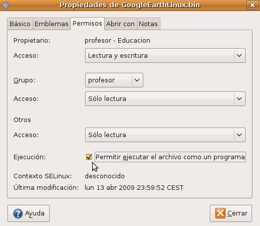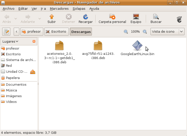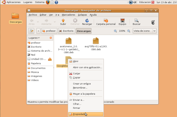 Google Earth nos permite volar a cualquier parte de la Tierra para ver imágenes de satélite, mapas, relieves, edificios en 3D… desde galaxias del espacio exterior hasta cañones de los océanos, por lo que se convierte en una aplicación indispensable para impartir contenidos de Geografía. Para instalarlo abrimos la carpeta Descargas (dónde lo habíamos guardado anteriormente después de descargarlo) y sobre el fichero GoogleEarthLinux.bin pulsamos el botón derecho del ratón. Aparecerá el menú contextual y en él seleccionaremos Propiedades.