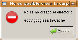 A continuación se nos presentará la siguiente pantalla, que nos informará de que no se puede crear la caché de GoogleEarth en el perfil del usuario "root"; pulsaremos en dicha ventana sobre el botón "Aceptar".