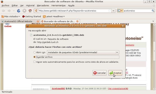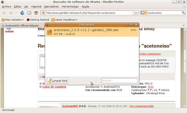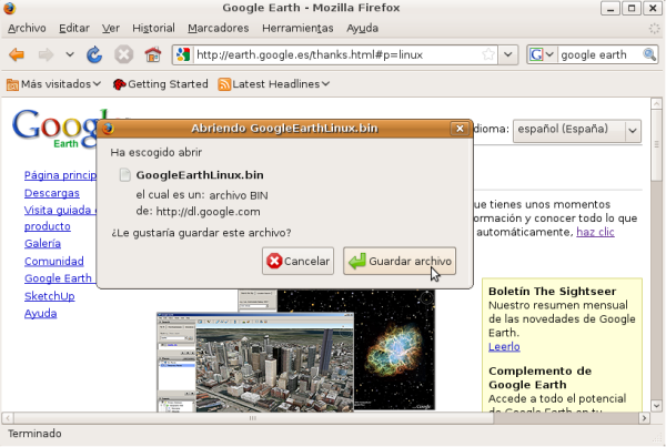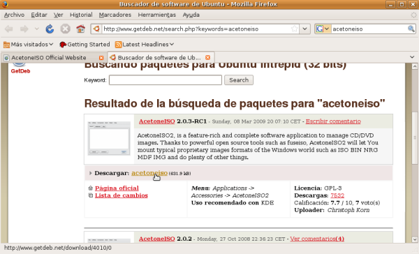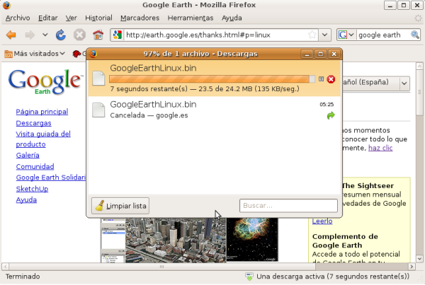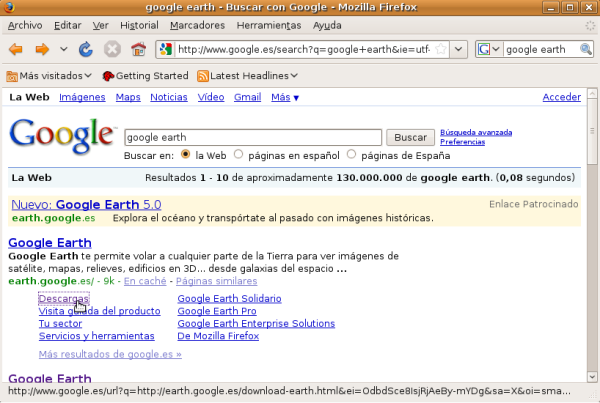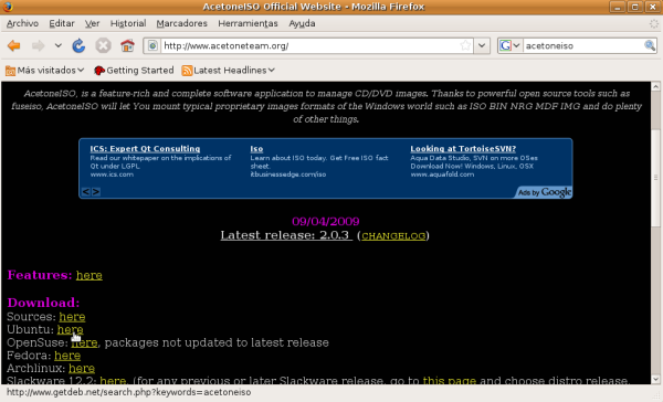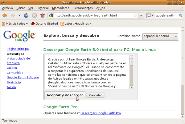 NOTA: Aunque en este apartado especificaremos los pasos precisos para descargar las aplicaciones reseñadas anteriormente, deberemos utilizar "Google Earth 5.0", "AcetoneISO 2.0.3" y "Clamtk 4.12", pues son las versiones testeadas y probadas para Ubuntu 8.10, la versión de Ubuntu con la cual ha sido elaborada esta documentación.