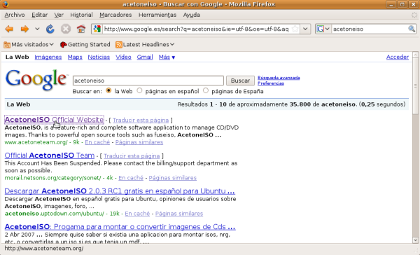 A continuación procederemos a descargar AcetoneISO, para lo cual desde el buscador Google escribiremos acetoneiso. En la lista de enlaces que aparecerán a continuación pulsaremos sobre AcetoneISO Official Website tal y como se muestra en la siguiente figura.