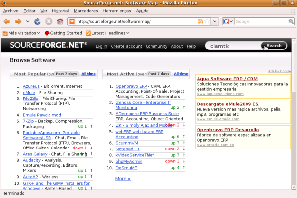 Finalmente para descargar el entorno gráfico el antivirus Clamtk , lanzaremos el navegador Firefox y en el URL escribiremos http://sourceforge.net/softwaremap/ (en el momento de escribir este material). En el cuadro de búsqueda escribimos clamtk tal y como se muestra en la siguiente figura.