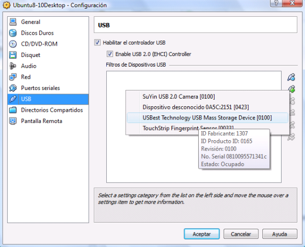NOTA: Puede ocurrir que el nombre del dispositivo reconocido por VirtualBox no coincida exactamente con el mostrado en la ventana de la imagen superior.