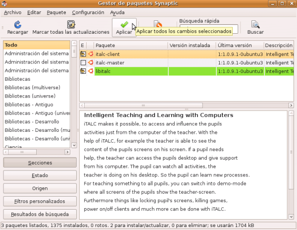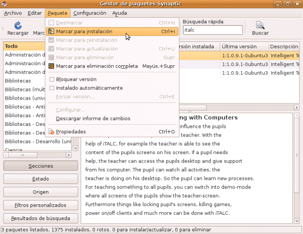 En el gestor de paquetes Synaptic, en la caja de texto de Búsqueda rápida, escribiremos italc. Vemos que aparecen tres paquetes relacionados con iTALC. Seleccionaremos italc_client.
