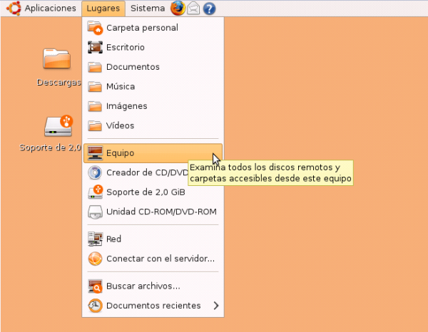 Para ello abriremos el navegador de archivos desde Lugares->Equipo.