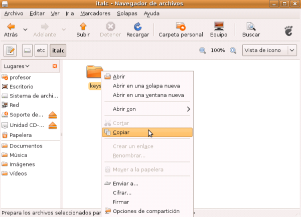 Navegaremos hasta la carpeta /etc/italc y en ella pulsaremos el botón derecho del ratón sobre la carpeta keys y en el menú contextual seleccionaremos Copiar.