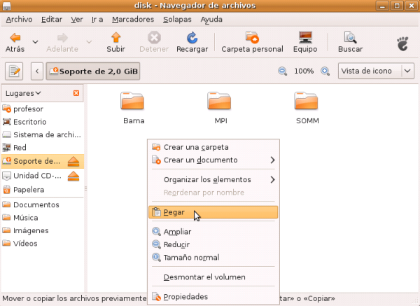 Nos situamos en el lápiz de memoria y una vez estemos en el mismo pulsamos el botón derecho del ratón y en el menú contextual seleccionaremos Pegar.