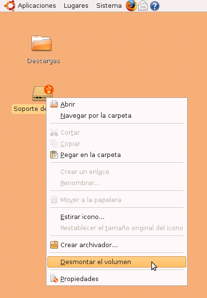 Seguidamente expulsaremos la llave usb pulsando el botón derecho del ratón sobre el icono que representa al lápiz usb y en su menú contextual seleccionaremos Desmontar el volumen.